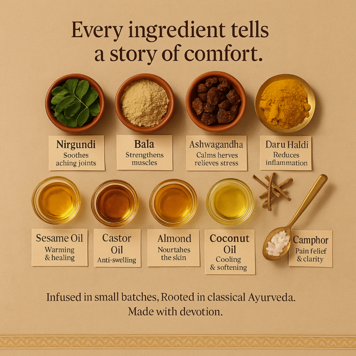 • Mahanarayan-inspired herbs – Ashwagandha, Bala, and Dashmool for strengthening muscles