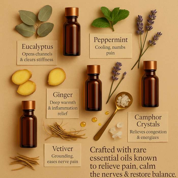 Enriched with cold-pressed sesame, almond, and castor oils, every drop boosts circulation, warms tired muscles, and nourishes tissues. The cooling whisper of eucalyptus and the grounding aroma of vetiver complete the ritual, making it as calming for the mind as it is for the body.