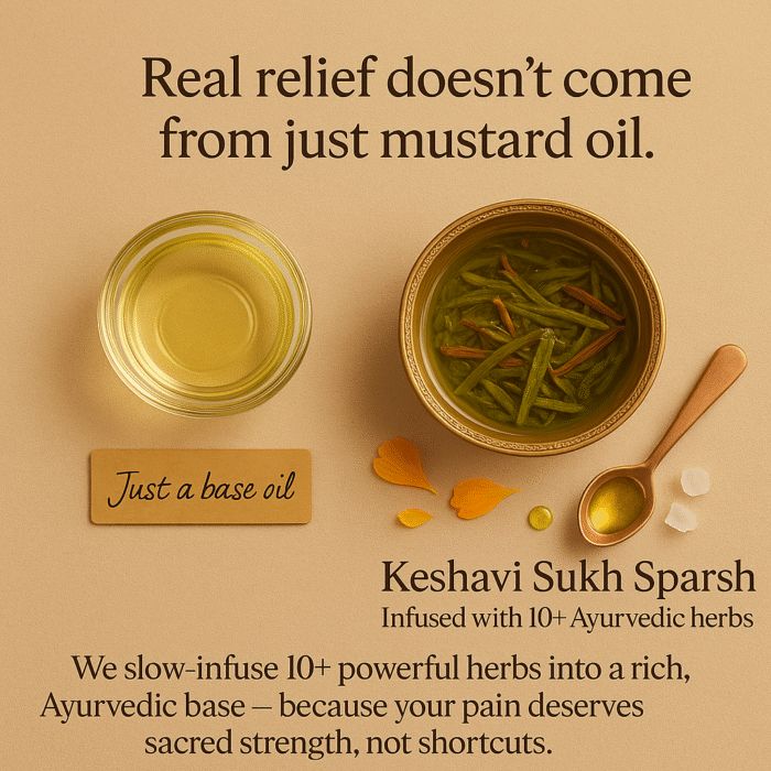 A: Sukh Sparsh is made from cold-pressed base oils like Black Sesame and Jojoba, infused with Ayurvedic pain-relieving herbs such as:
