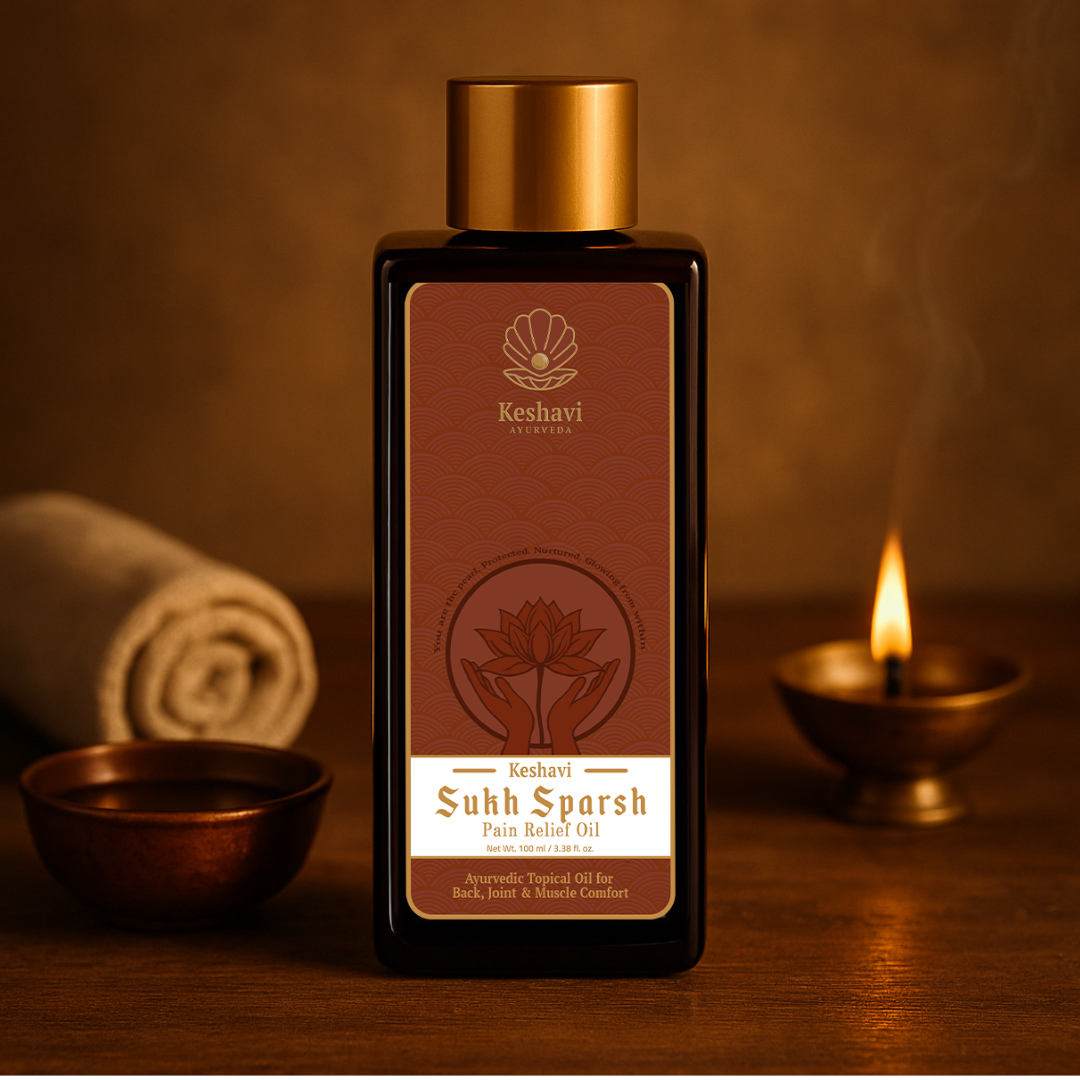 A: Sukh Sparsh is a luxurious Ayurvedic pain relief oil crafted to ease muscle stiffness, joint discomfort, and fatigue. Infused with herbs traditionally used in Panchakarma therapies, it is designed to relax sore muscles, improve blood circulation, and provide a deeply calming, healing experience.